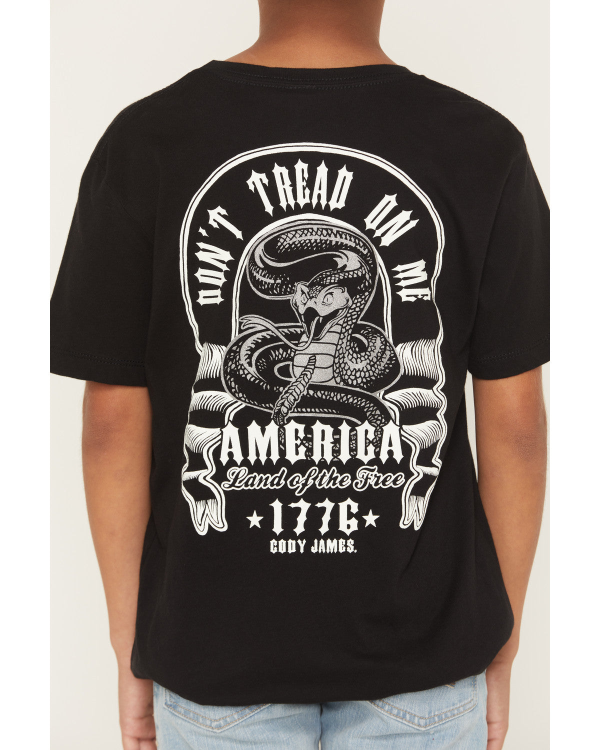 • Metallic snake graphic on back with "Don't Tread On Me / America / Land of the Free / 1776 / Cody James"
