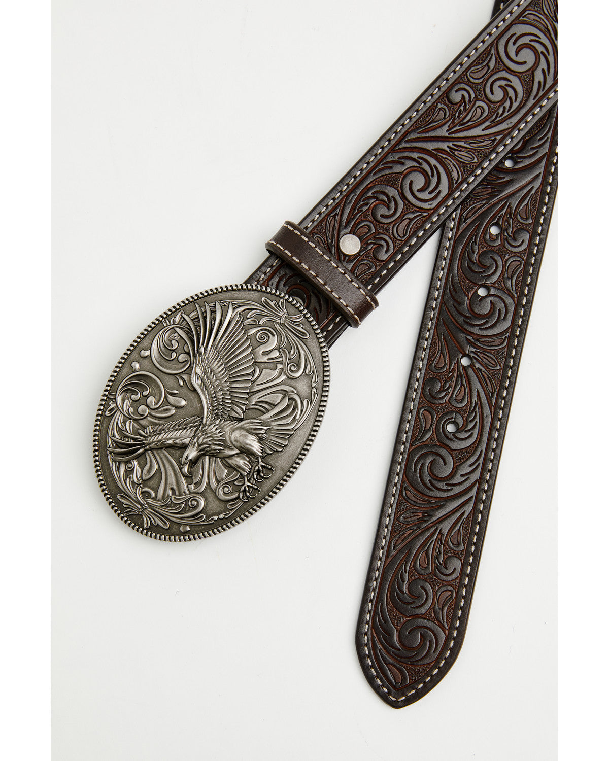 • Silver-toned oval buckle with eagle accent and roped border